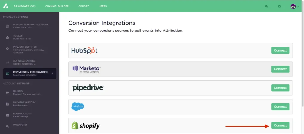 Using Attribution’s Shopify integration is simple. Just go to the Conversion Integrations page in your account settings and click "Connect":